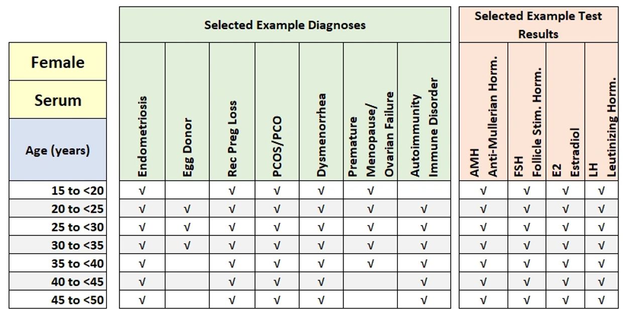 A wide range of reproductive health conditions are represented such as endometriosis, PCOS, autoimmmunity, as well as healthy females without reproductive health issues. Below is an example subset available data in sera collected from females.